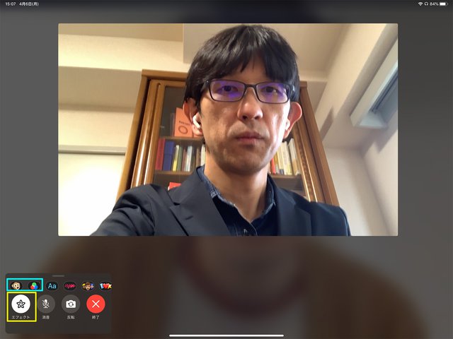 iPadOSの画面。黄色く囲ったアイコンをタップすると各種エフェクトが選べるように。水色で囲ったアイコンがアニ文字・ミー文字、フィルター