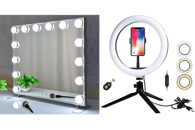女優ミラー(左)やリングライト(右)など、顔に光を当てるグッズも多数