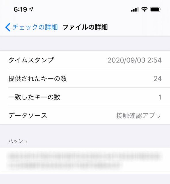 「一致したキーの数」が「1」と表示されている。陽性者と接触したことを示していると思われる