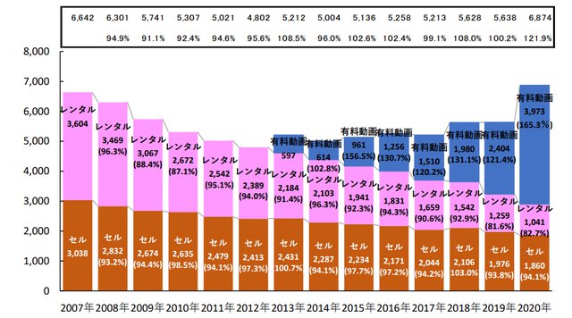 「映像ソフト市場規模及びユーザー動向調査」図表。配信市場(有料動画)の増加傾向に対して、セル・レンタルは減少傾向にある