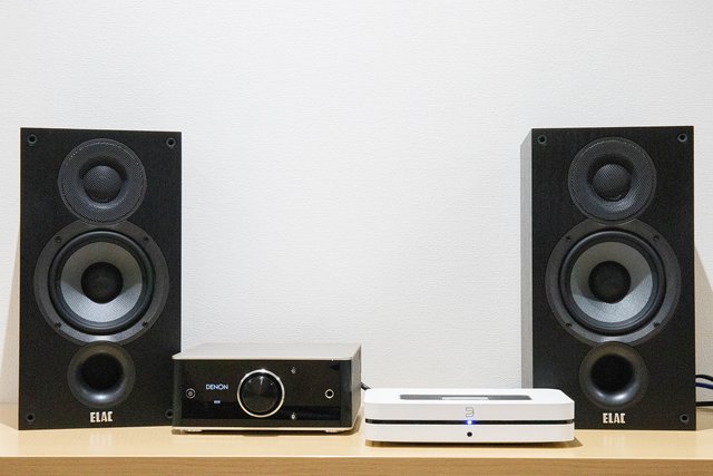 ネットワークプレーヤーとしてBluesoundの「NODE 2i」(OPEN/実売75,000円前後)、DENONのプリメインアンプ「PMA-30」(55,000円/税込)、スピーカーにELACの「Debut B5.2」(60,500円/税込)を用意。このシステムをベースに、どのようにグレードアップしていくか考えてみよう