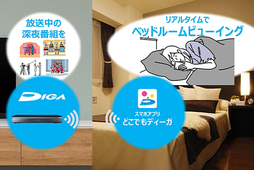 無料のスマホアプリ「どこでもディーガ」とブルーレイレコーダー「ディーガ」を連携させることで、録画番組の視聴や放送番組のリアルタイム視聴も可能。リビング以外のお部屋でもかんたんに録画番組が視聴できます。
