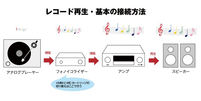 レコードからピックアップされる音楽信号は非常に小さいため、フォノイコライザーとアンプを使って、スピーカーで再生できるまでに増幅します
