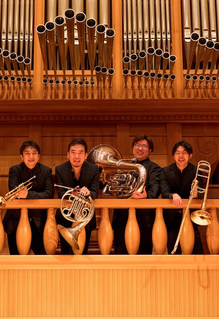 アーク・ブラスのコアメンバーの4人。左からトランペットの佐藤友紀、ホルンの福川伸陽、テューバ次田心平、トロンボーン青木 昂。コアメンバーのほかに、今回のアルバムではアソシエイトプレイヤーとしてさらに6人が参加する