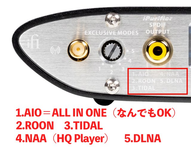 ZEN Streamは、背面の「Exclusive Mode」(排他モード)の設定が変更できる。1.のAIOでも再生できるが、音質面では排他モードにしたほうが有利。今回は2.ROONと5.DLNAを使用