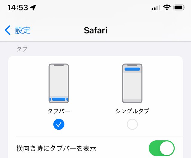 [設定][Safari]で[シングルタブ]を選べば従来型表示に戻せます