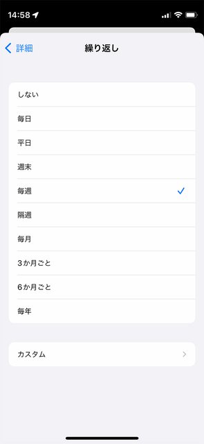 例えば[毎週]を選んだ上で重ねて[カスタム]をタップ