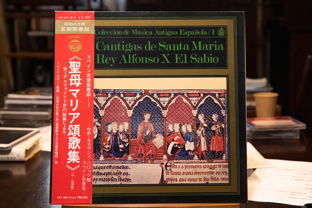 黒崎氏の愛聴盤『スペイン古音楽集成1 聖母マリア頌歌集』。中世・ルネサンス・バロック期のスペイン音楽が収録されている(日本コロムビア/1975年)