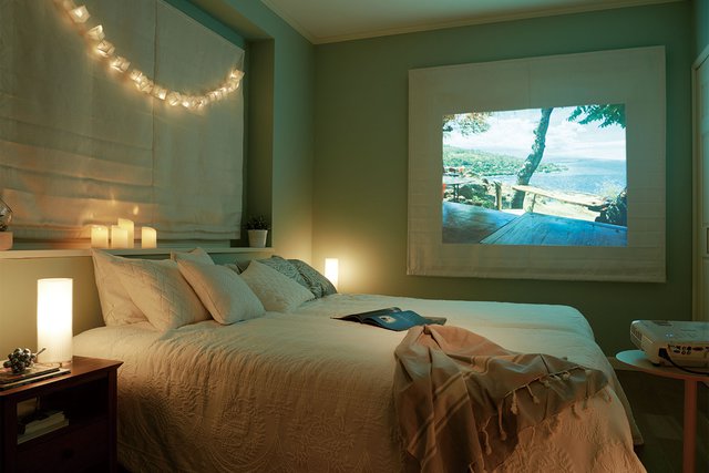 1階寝室に設えられたホームシアターです。自然の映像を投写すれば、眠りにつくひとときも安らぎに包まれます。
