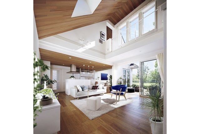 新たな「平屋」スタイルを提案するフリー設計商品「WESTWOOD(ウエストウッド)」。1階から屋根裏空間につながる大勾配天井で開放感にあふれています。