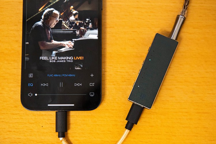 「GO bar」はMQAのフルデコードも可能なのでMQA音源も再生。写真では分かりづらいがMQAランプがブルーに光っている