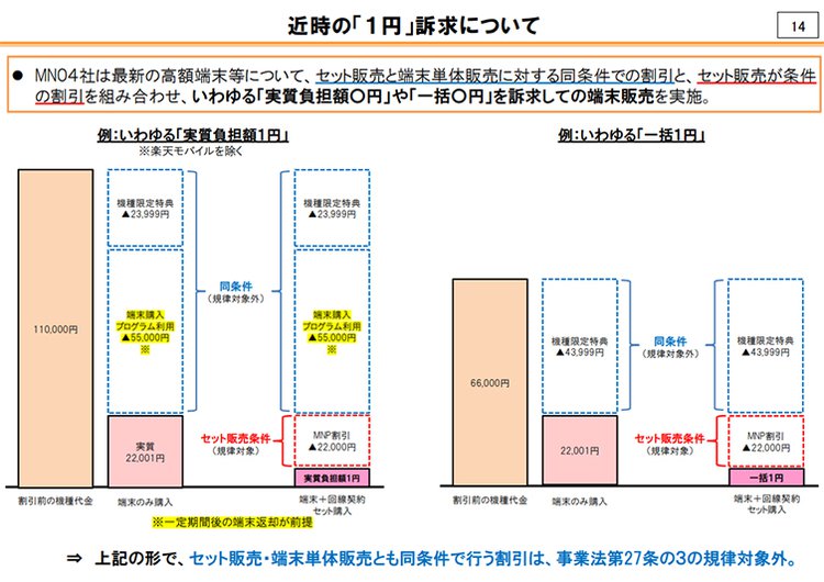 総務省「競争ルールの検証に関するWG」第33回資料より。現在の端末大幅値引き販売は、端末の価格自体を大幅に値引きし、それに回線契約に伴う値引きも追加して実現している