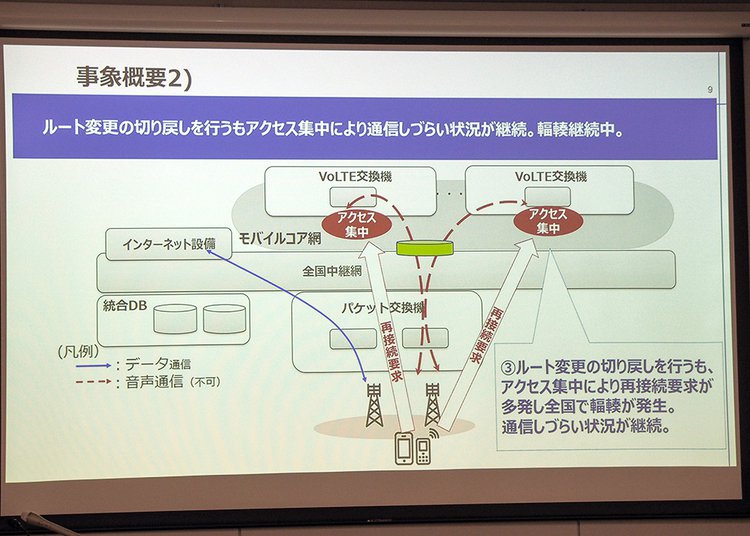 不通を解消するためルートを元に戻したところ、VoLTE交換機にアクセスが集中して輻輳状態となり、通信がしづらくなってしまった