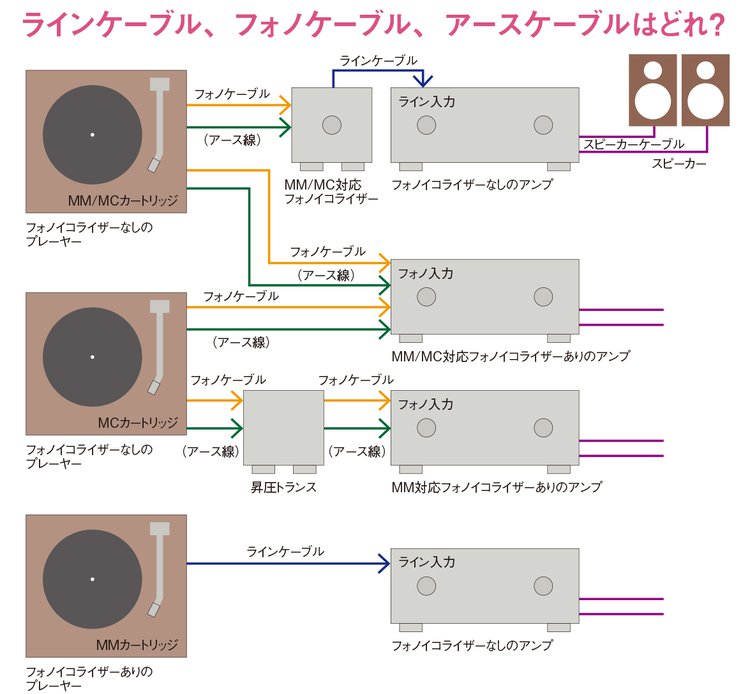 フォノケーブルやアースケーブルは、ノイズをより拾わないようにするため、電源ケーブルからなるべく離すなど、引き回しのコツがある。アースを繋いだのにノイズが出るときは、ケーブルの位置を動かしてみよう。またケーブルは、コイルとして磁界の影響などを避けるため、束ねたり巻いたりせずに配置させる