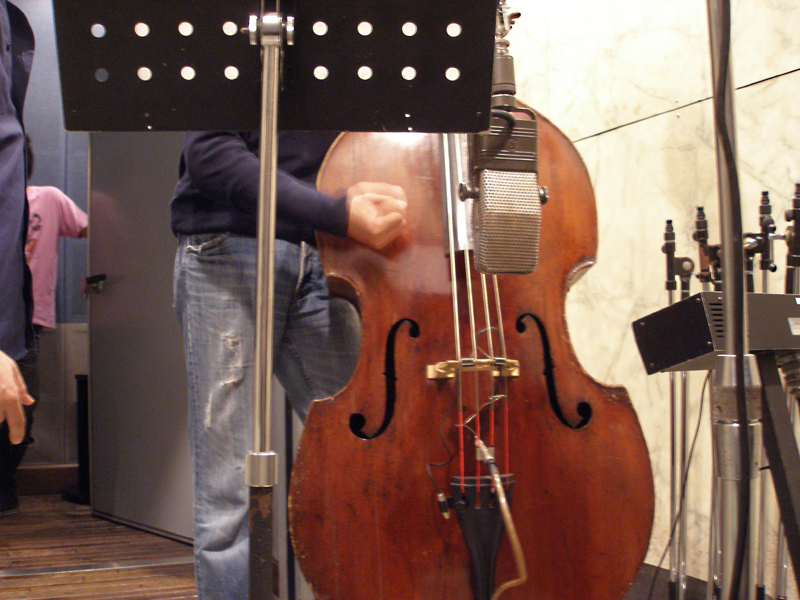 「旅立つ人へ」冒頭、パーカッションを叩くような音が入っているが、実はウッドベースを叩く音なのである。録音へ向け、竹下欣伸さんが練習しているショットだ