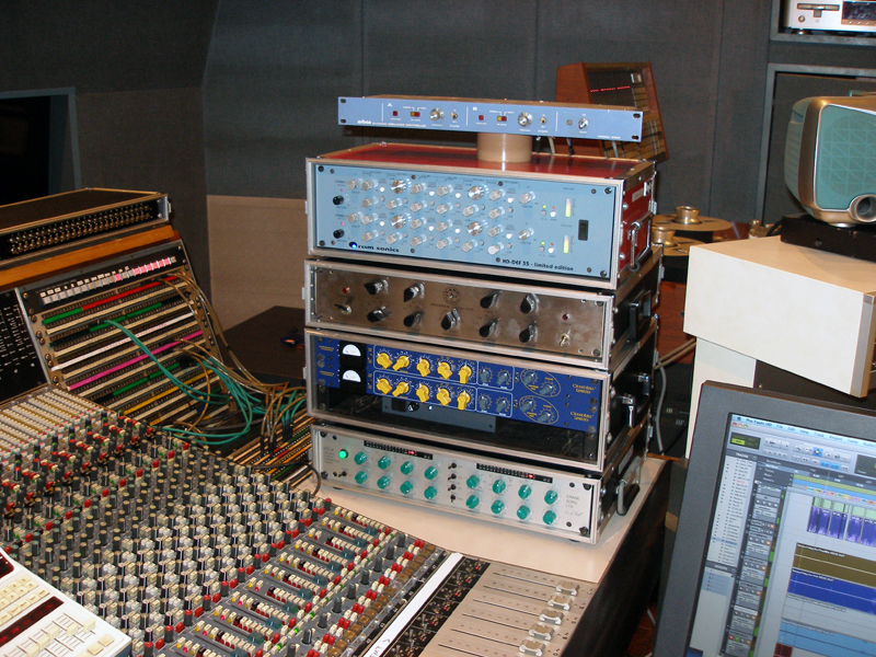 ミックスダウンの際、メインコンソールの脇へセッティングされたエフェクター群。このときは一番下のトータルコンプレッサー「クレーンソングSTC− 8」と、上から2段目のイコライザー「オーラムソニックスHD− DEF35」が活用されていた