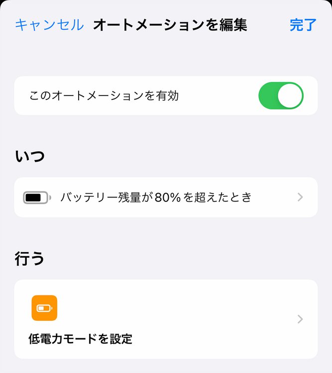 いつ「バッテリー残量が80%を超えたとき」→行う「低電力モードを(オンに)設定」
