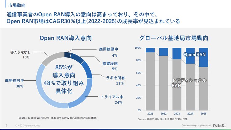 同じくNECの説明会資料より。オープンRANに対する関心は世界的に高まっており、その分商機はあると同社は見ているようだが、大手3社の寡占という現実があるだけに順調に導入が進むかどうかは未知数だ