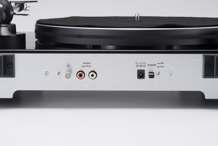 出力のRCA端子、アース端子、メイン電源スイッチともに、本体のリア面に装備される。電源は専用の付属ACアダプター(DC12V)を使用