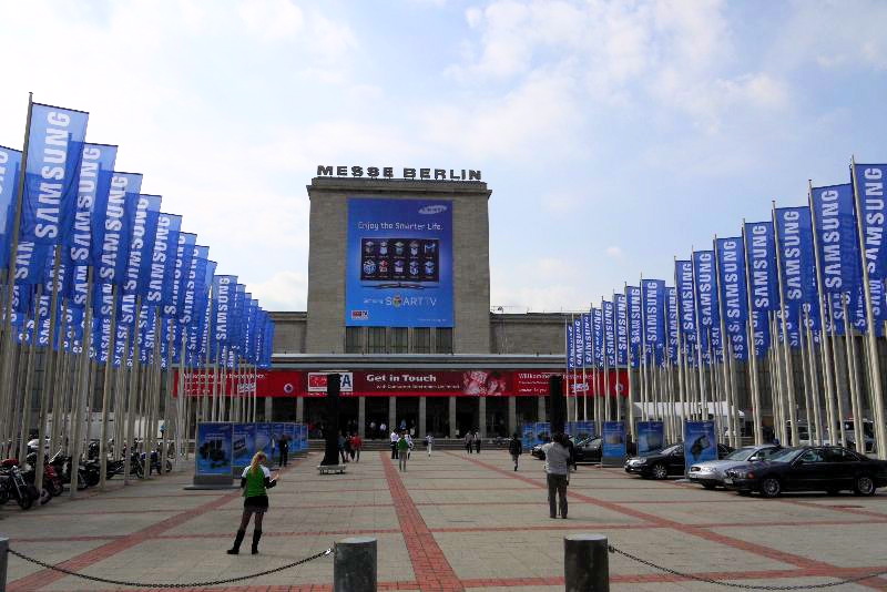 会場であるメッセ・ベルリンのメインエントランスはサムスンの広告がジャック