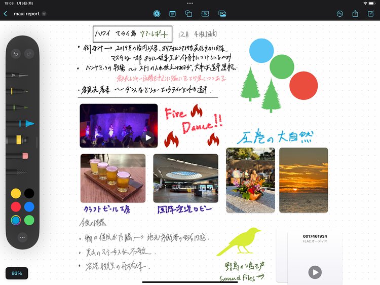 フリーボードアプリは手書き、デジタルタイピングのテキストや図形だけでなく、動画に静止画、オーディオのファイルを配置しながらマルチメディアクリエーションが楽しめる