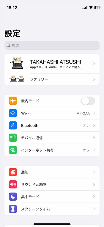[設定]アプリのいちばん上[自分の名前 Apple ID、iCloud+、メディアと購入]をタップ