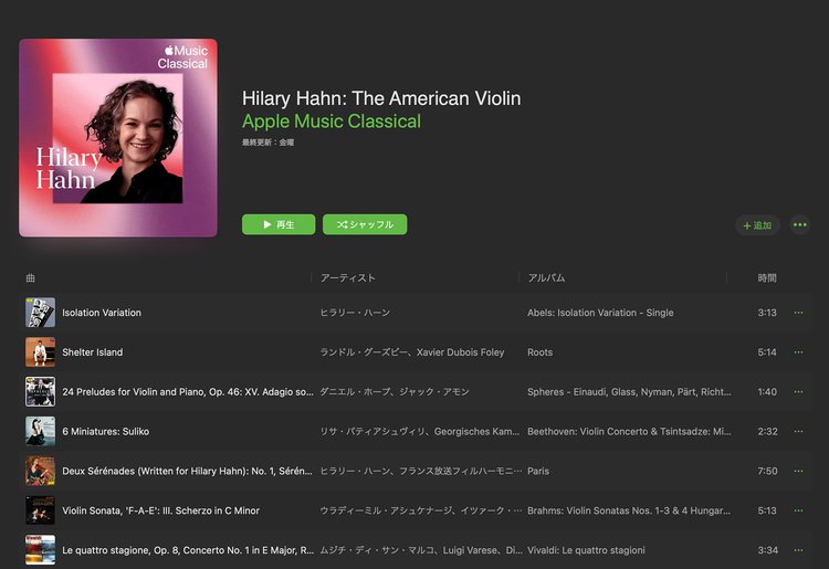 Apple Musicではヒラリー・ハーン氏が演奏した数多くの作品を配信している