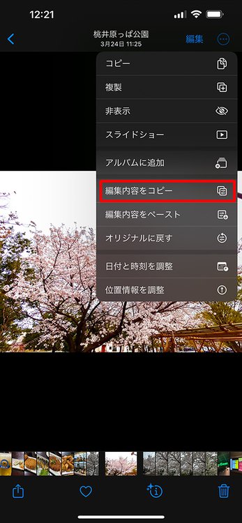 写真の編集を済ませてから「編集内容をコピー」をタップする