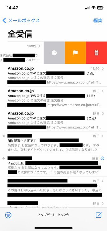 [メール]アプリでメール1通を指1本で左にスワイプした際のメニュー