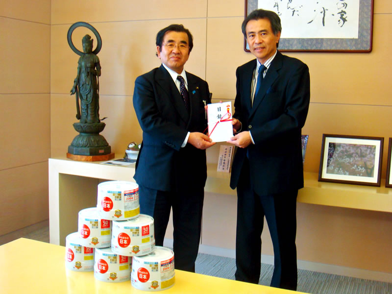 ザッツ製品の製造拠点「ザッツ福島」のある福島県の伊達市役所を訪問し、仁志田昇司市長へ義援金100万円を寄付。「がんばろう!日本」復興支援パッケージDVD-Rもあわせて寄贈され、その模様は、地元の福島民友新聞(10月12日付朝刊)にも取り上げられた