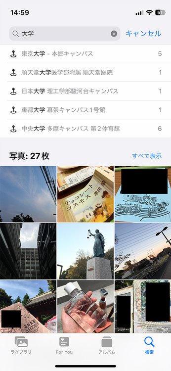 [大学]と入力した時点で撮影地情報に含まれる大学が検索候補にリストアップされるので、そこで絞り込むのあり