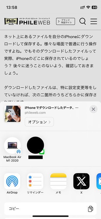 [共有]メニューで共有先として[リマインダー]をタップ