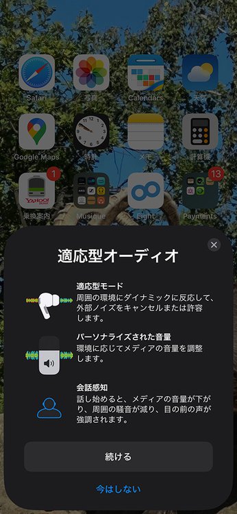 AirPods Proをペアリングすると適応型オーディオの解説が画面に表示される