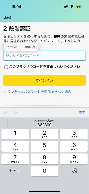 こちらはAmazonアプリのサインインの2段階認証画面。確認コード(ワンタイムパスワード)の入力欄を選ぶと自動で[メッセージからXXXXXX]の選択肢が表示されます