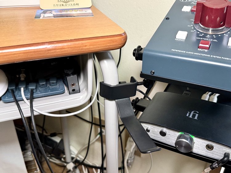 デスクの脚部やスチールラックのパイプも径さえ合えばマイクスタンド用アクセサリーを流用可能