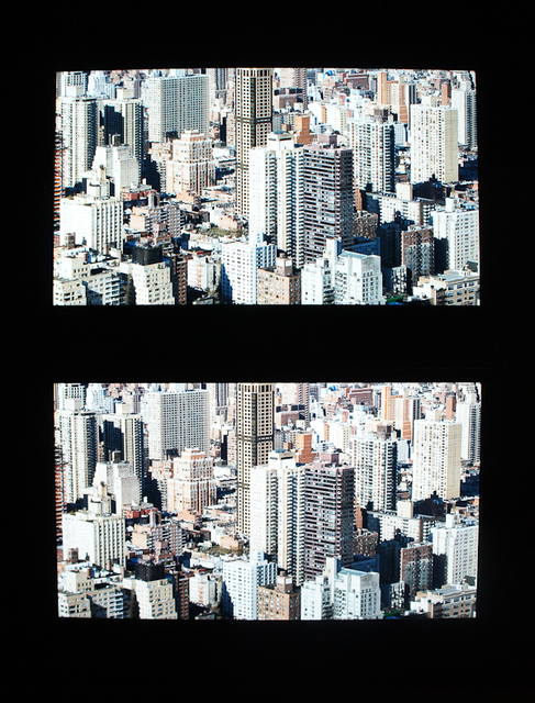 CESで参考出展されていたパナソニックのデモ。フルHDモデル(上)と4Kモデル(下)の比較展示を行っていた