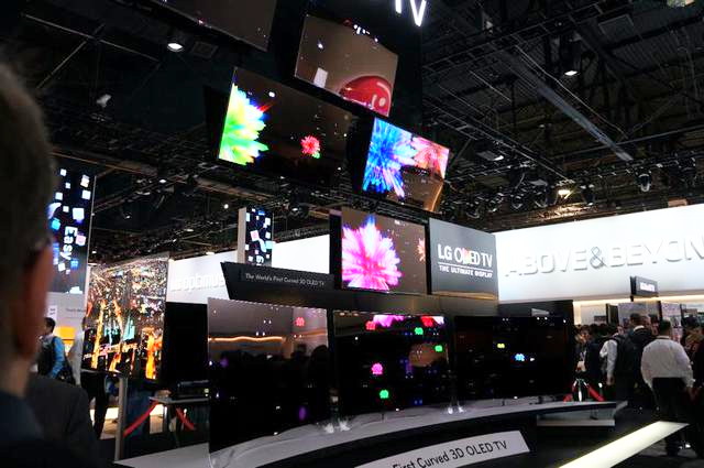 LGも負けじと、世界初のカーブした有機ELテレビを吊り下げ来場者の注目を集める