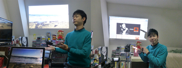 大阪府・備瀬さんのホームシアター。角部屋の傾斜した壁に映像を投射して楽しむこともできる。webページや写真を大画面で見るのにも使用可能だ