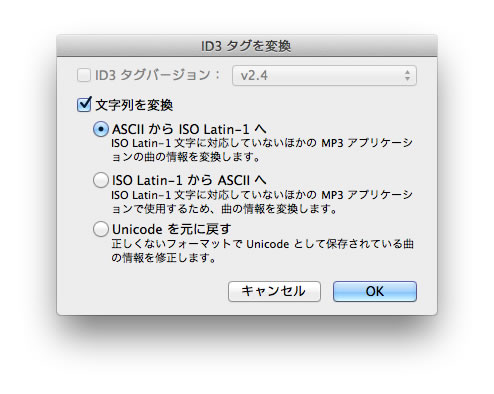 iTunesには、ID3タグのバージョンおよび文字コードを変換する機能が装備されている