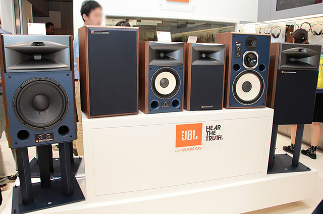 特別試聴室の前には「4312E」などのスタジオモニターシリーズや、マルチメディアスピーカー「STUDIO 5シリーズ」「STUDIO 2シリーズ」が並べられており、その場で音を確かめることもできる。