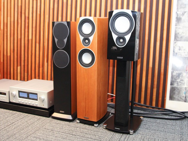 ラックスマンの試聴室に設置されたSX-2(右)、SX-3(中央)、MX-3(左)
