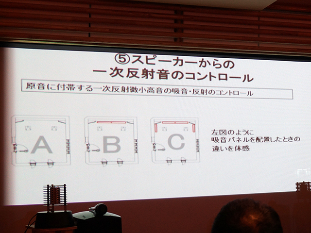 3パターンでデモ。一次反射音のコントロールの仕方によってどのように聴こえ方が変わるのかを確認した