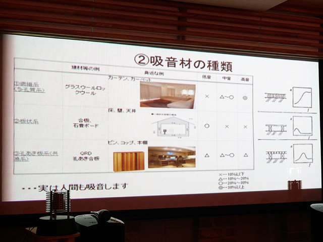 材質によって吸音する周波数帯域が異なることなど、吸音材の基礎知識もレクチャー
