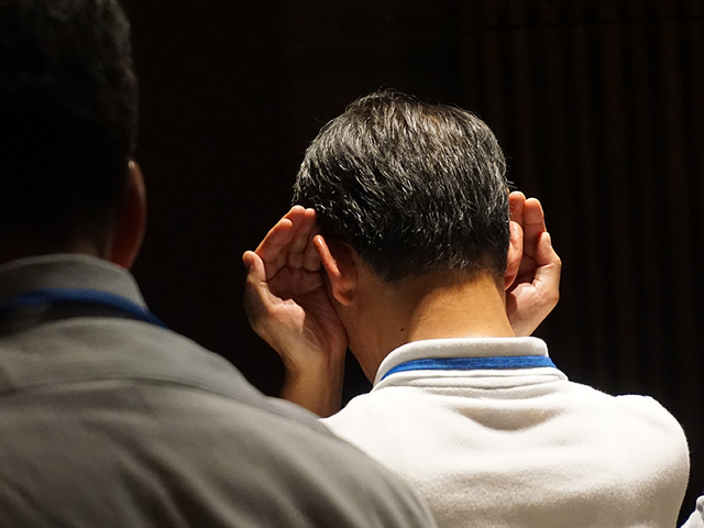 音源再生デモ中には手を耳の前や後ろに動かして聴こえ方の違いを確認する参加者の姿も