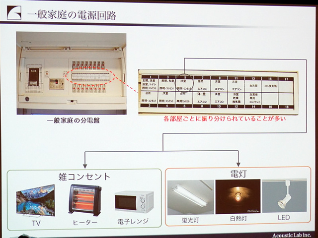一般的に電源は部屋ごとに系統が割り振られることが多く、オーディオ機器もそのほかの機器と電源を共有することになる等の基礎知識も解説