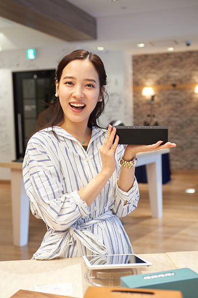 アナログレコード体験の前に、ギブソンショールームを見て回る奈津子さん。Bluetoothスピーカー「SAS200」を手に「小さいのに低音の振動がブルブル来ますね!」
