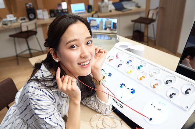 オンキヨーのカスタムIEM「IE-Cシリーズ」を手にする奈津子さん。12色のカラバリのうち、「私なら女子力を高めるためにマゼンタを選ぶかな〜。左右で色を変えられるのもいいですね」
