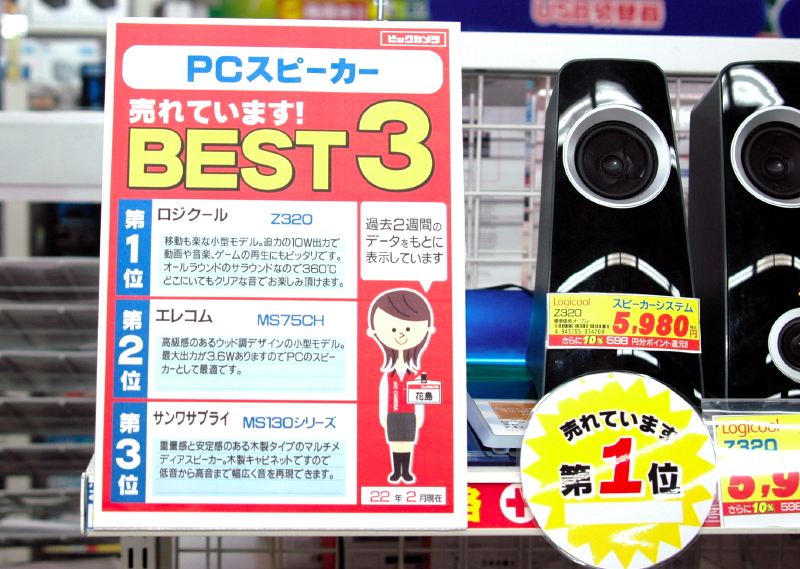 取材を行った2月8日時点でのビックカメラの売れ筋ランキング。1位はロジクール「Z320」、2位には木製キャビネットのデザインが魅力のエレコム「MS75CH」
