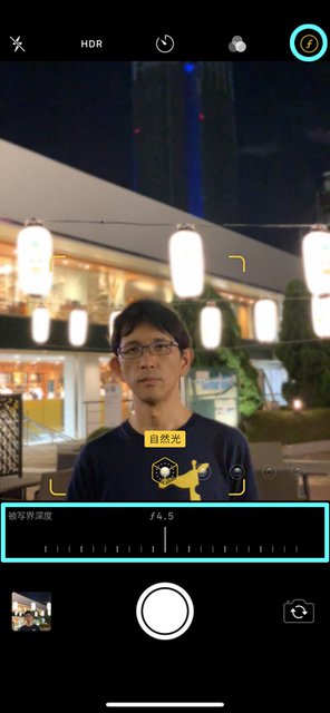 iPhone XS Maxのカメラアプリの画面。右上のブルーで囲んだアイコンをタップすると被写界深度コントロールのスライダーが表示される