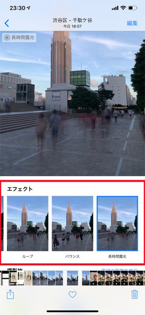 写真アプリからLive Photoを選択。画面を上に向かってスワイプすると3つのエフェクトが選択できるようになる